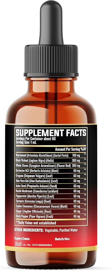 • ✔️ Ingredients Overview: Wormwood Liquid Drops are crafted with a diverse blend Wormwood Herb, Black Walnut, Whole Cloves, Berberine HCl, Oregano Leaf, Aloe Vera Gel, Anise Seed, Reishi Mushroom, Peppermint Leaf, Turmeric, Ceylon Cinnamon, and Ginger Root.