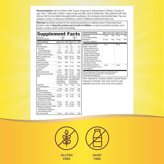 • Formulated with 20 vitamins and minerals, including vitamin C, vitamin D3, and high potency B-vitamins to help convert food into cellular energy, alongside Orchard Fruits & Garden Veggies Powder Blend (150 mg per 2- tablet seving).*