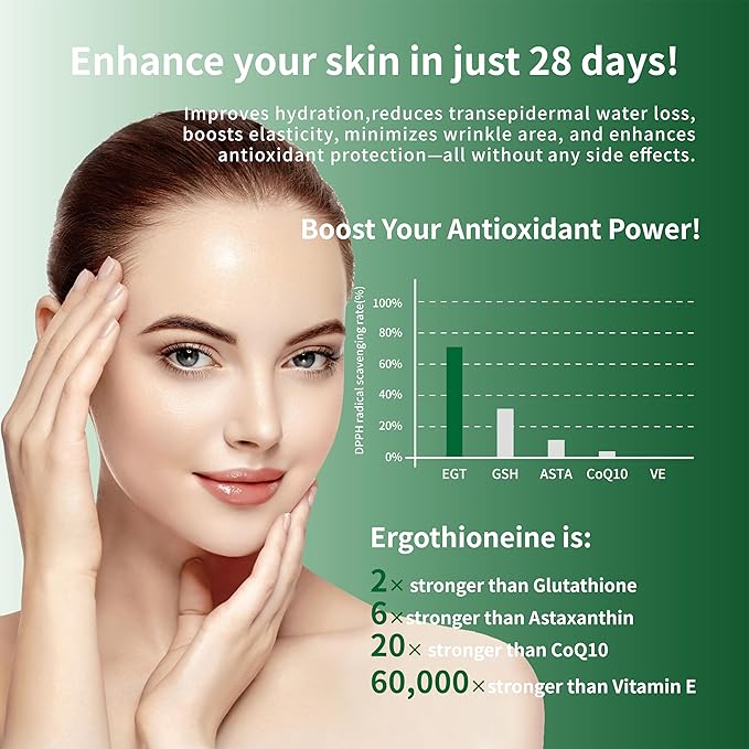 - Superior Anti-Aging Benefits: GeneIII Ergothioneine is a powerful antioxidant, boasting 2x the strength of glutathione, 6x astaxanthin, 20x coenzyme Q10, and 60,000x vitamin E. It uniquely penetrates cellular mitochondria, fighting free radicals and supporting deep sleep, rejuvenating beauty, and delaying aging