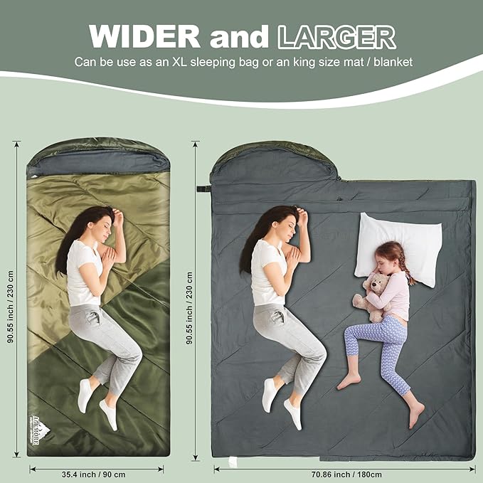 • LARGE AND ROOMY: Our single sleeping bag measures (78.7+11.8)in x 35in,double sleeping bag measures (78.7+11.8)in x 61in, fits for people up to 6ft tall with plenty of room to stretch or roll over. The separated bottom zipper lets you ventilate the foot section for better temperature control. On warm nights, unzip it and use like a blanket.