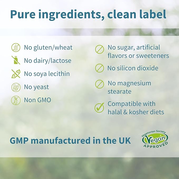 - PURE & CLEAN: vegan, non-GMO, hypoallergenic ingredients, with no sugars, artificial flavors, sweeteners or unpleasant additives. Lab-verified ingredients, GMP manufactured in the UK