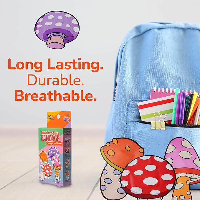 - MUSHROOM BANDAGES: This 24 piece pack of mushrooms shaped bandages features 4 fun mushroom shapes, and is great for putting a smile on kids' faces while protecting wounds such as cuts, scrapes, and burns; sticky bandages come in a cute cardboard box and are perfect for kids and adults alike, and also for school nurses and pediatric doctors