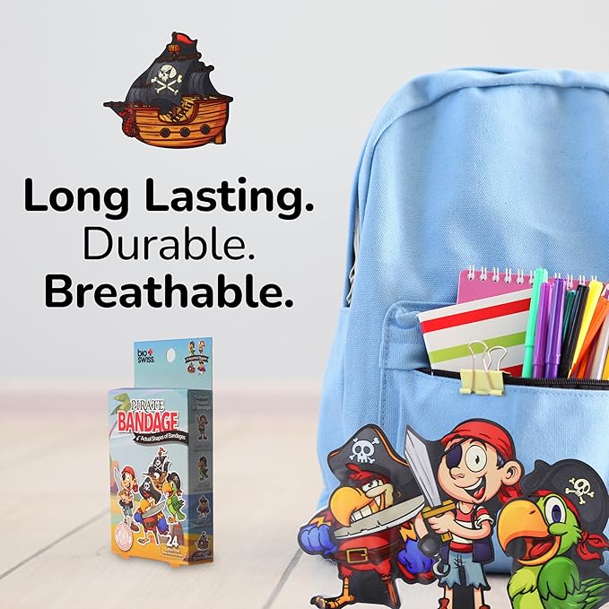 - PIRATES BANDAGES: This 24 piece pack of pirate shaped bandages features 4 fun pirate, parrot, and pirate ship shapes, and is great for putting a smile on kids' faces while protecting wounds such as cuts, scrapes, and burns; sticky bandages come in a cute cardboard box and are perfect for kids and adults alike, and also for school nurses and pediatric doctors