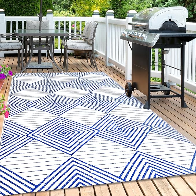 Waterproof Outdoor Rug 5x8ft, Foldable Reversible Plastic Straw Mat for Patio RV Deck Porch Backyard Balcony Camping Picnic Beach Indoor Outdoor Carpet, Blue&White