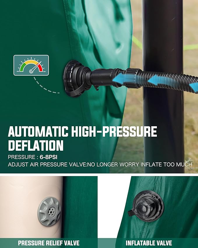 • 【EASY INSTALLATION】The inflatable camping tent does not need manual installation of support rods, and it has TPU inflatable pillars. Equipped with a manual hand pump, then you can finish assembling the camping tent in only 5 minutes.Equipped with durable steel nails and windproof rope make the tent more stable. Make your camping trip more enjoyable and comfortable.