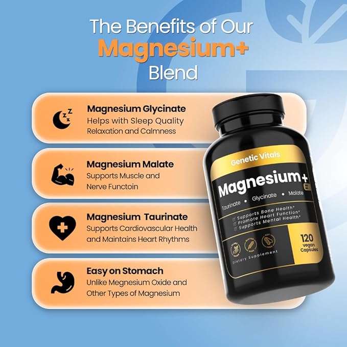 - Premium Chelated Magnesium Blend – Formulated with Magnesium Glycinate, Malate, and Taurate for optimal absorption and bioavailability