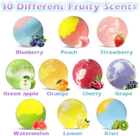 - [10 UNIQUE FRUITY SCENTS] - This bath bomb set includes 20pcs balls, and there are 10 natural scented smell of kid’s favorite including Peach,Cherry, Strawberry, Blueberry, Green Apple, Grape, Orange, Lemon, Kiwi, Watermelon. Multiple smells give you more choices, ensure a diverse and enjoyable bathing experience.