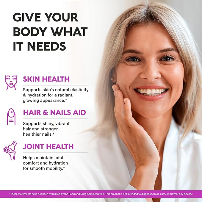 - Premium Beauty Blend β Supports skinβs natural elasticity and hydration, delivering a radiant glow from within. Experience the benefits of vibrant, shiny hair and stronger, healthier nails. This blend also supports smooth joint mobility, helping you feel as great as you look!