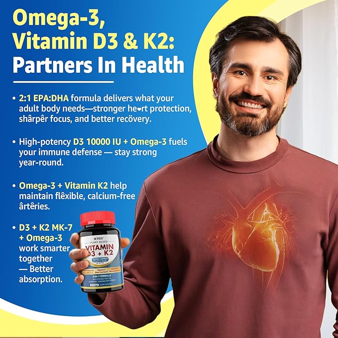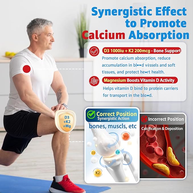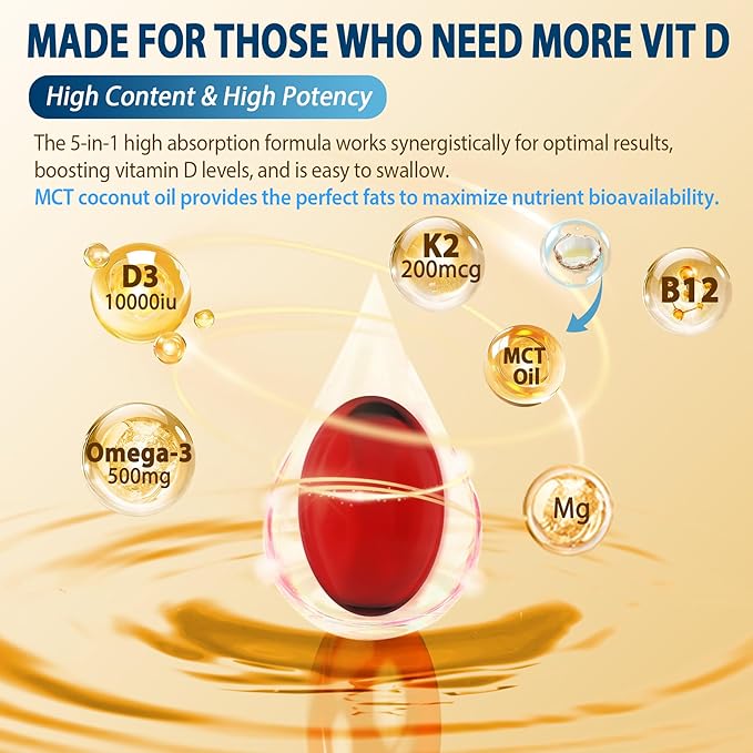 • Bone & Muscle Function: Each softgel delivers 10,000 IU of Vitamin D3 and the most absorbable form of Vitamin K2 (MK-7). D3 and K2 helps your body absorb calcium efficiently, supporting healthy bones and proper π–Όπ—‚π—‹π–Όπ—Žπ—…π–Ίπ—π—‚π—ˆπ—‡. Plus, Magnesium works to keep your muscles in good shape, π—‚π—†π—‰π—‹π—ˆπ—π—‚π—‡π—€ π—‰π–Ύπ—‹π–Ώπ—ˆπ—‹π—†π–Ίπ—‡π–Όπ–Ύ throughout the day. 𝖨𝖽𝖾𝖺𝗅 π–Ώπ—ˆπ—‹ busy professionals, those with limited sun exposure, and seniors, it helps you stay energizedβ€”even on days with minimal sunlight!