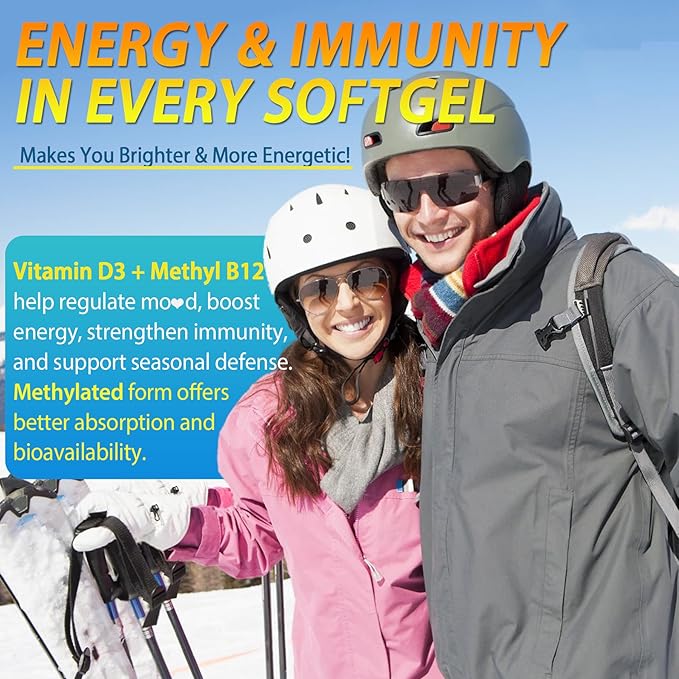 • Energy & Immune Support: Vitamin B12, in the form of methylcobalamin, is the active form of B12, making it easier for the body to absorb and use. B12 supports red π–»π—…π—ˆπ—ˆπ–½ cell production, nerve function, and boosts energy. Vitamin D3, B12, and Magnesium help promote relaxation and enhance overall vitality. The powerful Vitamin D3 10,000 IU supports a strong immune system, while B12 helps maintain steady energy levels throughout the day.