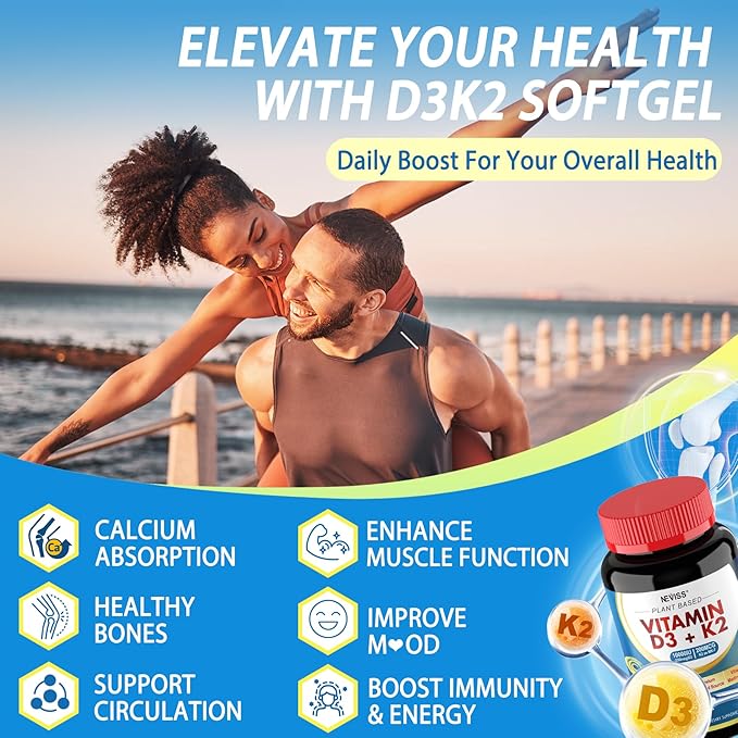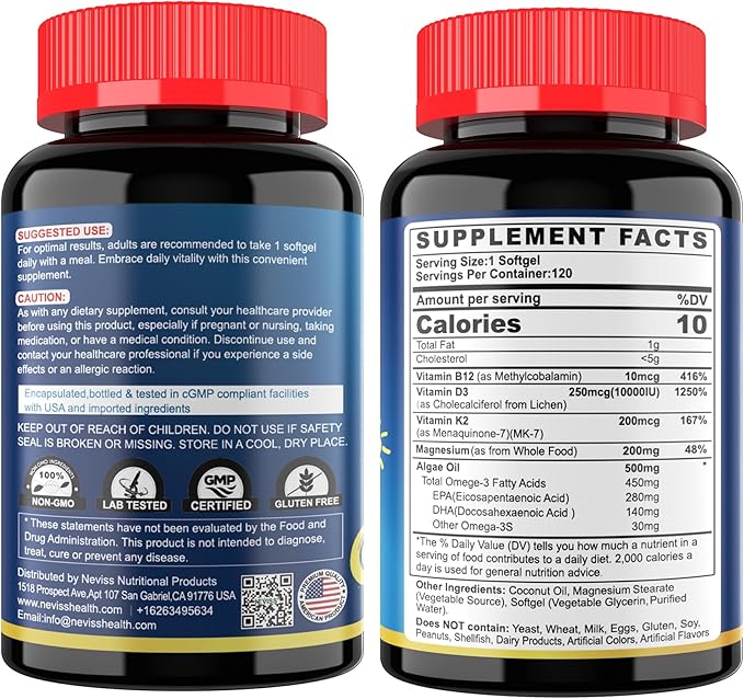 • Powerful Formula: NEVISS Vitamin D3 K2 supplement combine Vitamin B12, D3, K2, and Magnesium, Omega-3 Algae Oil to provide essential support for bone 𝗁𝖾𝖺𝗅𝗍𝗁, muscle function, brain and energy. Infused with organic coconut-sourced MCT oil, our D3 softgels help your body absorb these essential nutrients effortlessly. They’re small, easy to swallow, and completely flavorlessβ€”making it simple to π–»π—ˆπ—ˆπ—Œπ— your health anytime, anywhere!