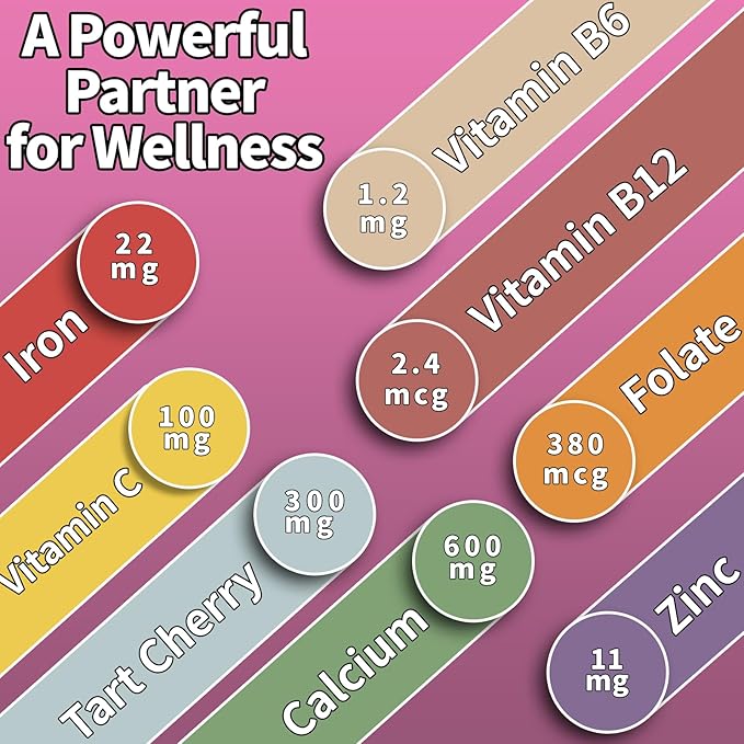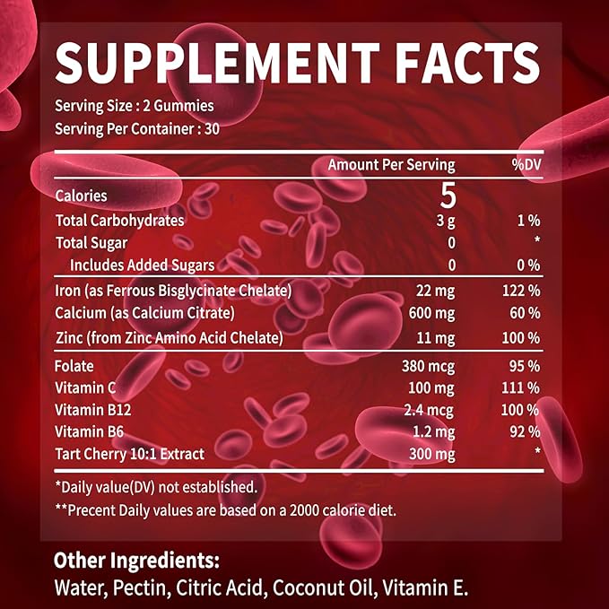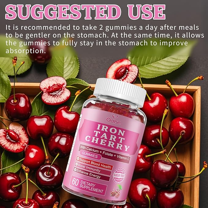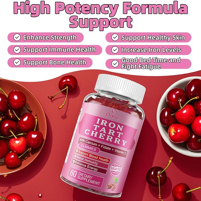 - FORMULA FOR MAXIMUM BENEFIT: OALSE's Iron Gummies are fortified with Calcium, Zinc, Vitamins C, B12, Folic Acid, and Tart Cherry Extract. Vitamins C and B12 assist the body in accelerating the absorption of iron. Folic acid is effective in relieving anemia and is an important element that pregnant women must take as a supplement. In addition, we have added tart cherry extract. Research shows that cherries are the fruit with the highest iron content. While relieving anemia, the rich anthocyanins* of tart cherries protect our skin, boost immunity and support good bed time