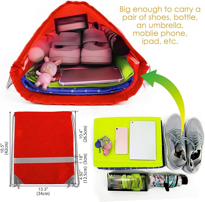 • 【LARGE CAPACITY & LIGHTWEIGHT】-- The drawstring backpack measures 16.5' x 13.4' and it is large enough to carry a pair of shoes, a bottle, an umbrella, lunch or clothes. These drawstring bags are made of high-density 210D polyester fabric. Lightweight and foldable, it is a good choice for home or travel. Provide you with a lot of convenience.