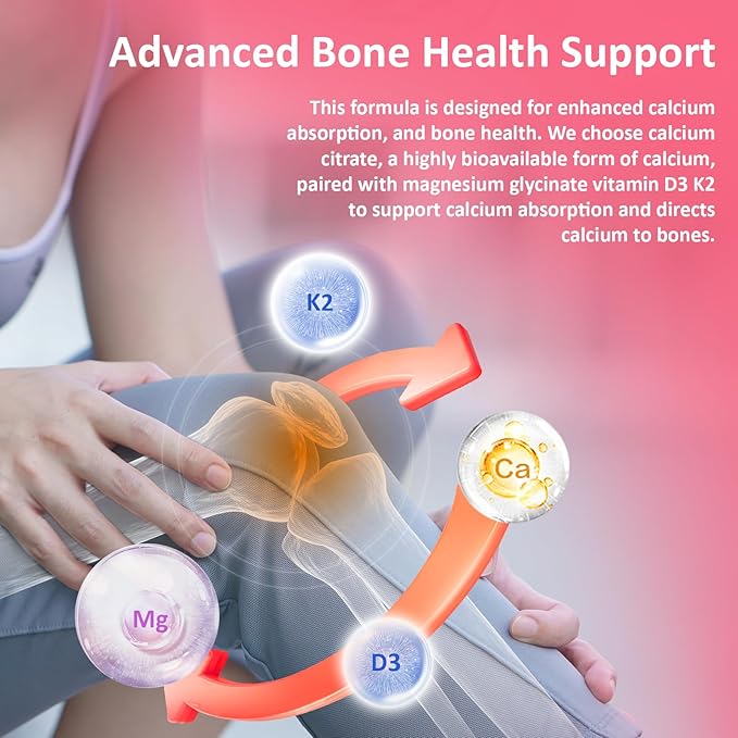 • Optimized Calcium Absorption: Vitamin D3 and K2 work together to guide calcium directly to bones, where it’s needed most, while magnesium helps maintain balanced calcium levels for comprehensive bone health