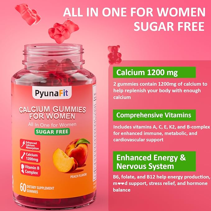 Calcium Gummies for Women 1200 mg, Calcium Chewables with Vitamin D3 Magnesium Zinc, Vegan, Sugar Free, Gluten Free, 60 Count