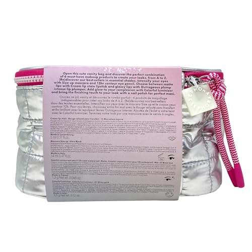 - INCLUDES: 0.12 oz / 3.5 g Colorful Luminizer in shade 01 Glitzy Gold, 0.17 fl oz / 5 mL Cream Lip Stain in shade 13 Marvelous Mauve, 0.045 oz / 1.3 g Colorful Contour Eye Pencil in shade 01 Black Lace, 0.47 fl oz / 14 mL Mascara Size Up in shade Ultra Black, 0.2 fl oz / 6 mL Outrageous Intense Lip Plumper in shade 01 Fever, 0.21 fl oz / 6.5 mL Nail Polish in shade 701 Pure Rose, and a Travel Vanity Bag.