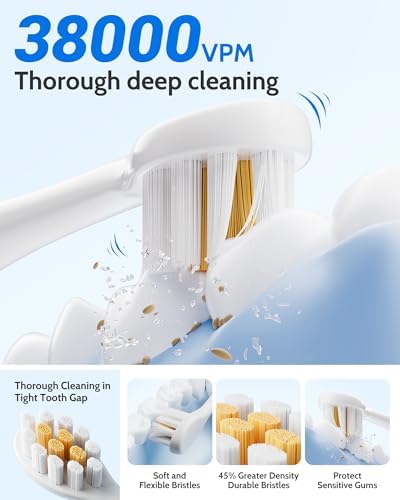 • POWERFUL SONIC CLEANING :New Upgraded Electric Toothbrush with the latest sonic technology,The vibration frequency can reach up to 38,000 times per minute, along the gum line for exceptional clean and remove up 100% plaques, whitening your teeth and improving your oral health in two weeks better than a manual toothbrush. kid electric toothbrush