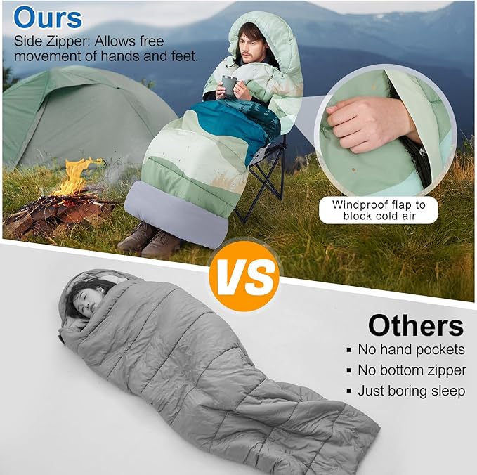 - Hand-out Design Sleeping Bag: Our adult sleeping bags feature a unique hand-out design, allowing you to move your arms freely without removing the bag, equipped with a windproof flap to keep out the wind, keeping you warm and comfortable