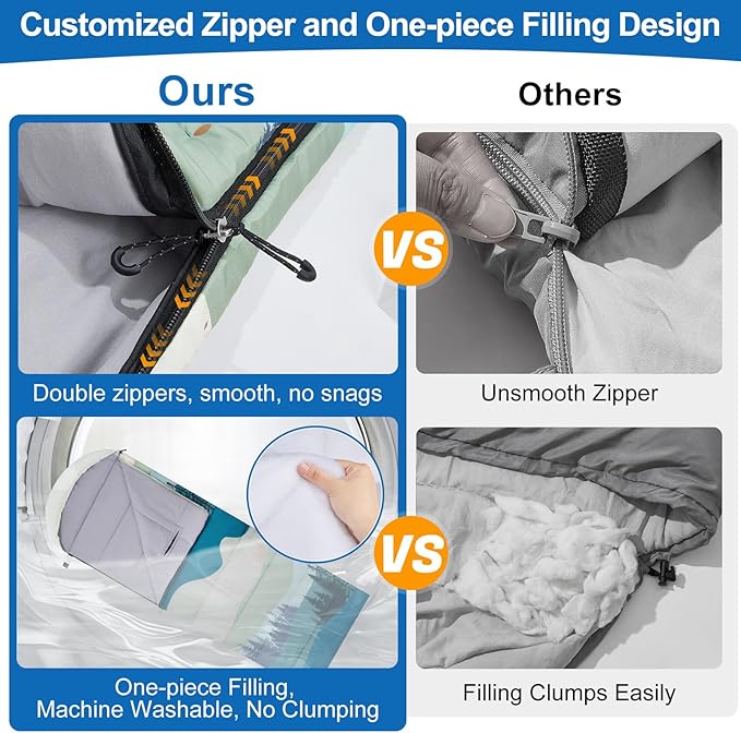 - Unique Design: Sleeping bags for adults, comes with a custom-printed pattern, bright colors, the smooth double zippers won't snag; Bottom zipper design, breathable, allowing your feet to move freely, and you can fully unzip the bottom to use it as a mat or blanket