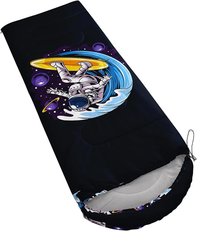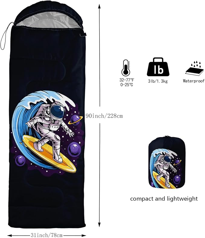 - Unique Astronaut Design:This Astronaut pattern sleeping bag is made of 3D digital printing with vibrant colors and patterns,size: 31W x 90L inches,temperature range: 32℉-77℉ (0℃-25℃),it also also have a weather resistant waterproof design to keep you warm and prevent you from any dampness,can be used in 3 seasons