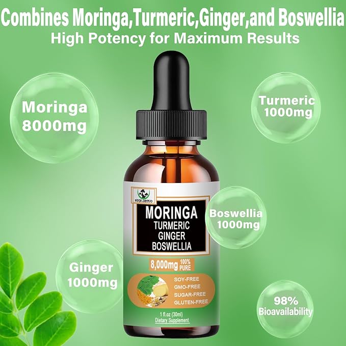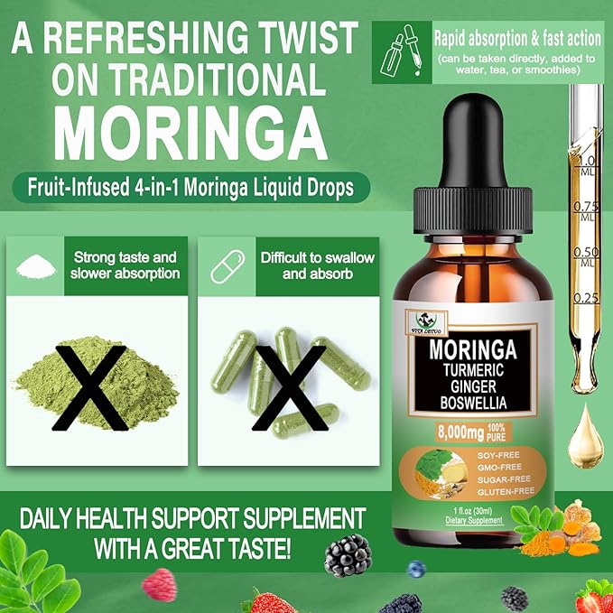 - WHY OUR MORINGA? Our premium Moringa Liquid Drops combines the potent benefits of Moringa, Turmeric, Ginger, and Boswellia for a comprehensive immune boost and optimal wellness. Unlike traditional Moringa capsules, our formula works synergistically to enhance antioxidant protection, support digestion, detoxify the body, and improve energy levels.* Experience the full power of nature with a supplement that offers balanced, all-around health support, helping you stay vibrant, energized, and immune-strong—naturally.