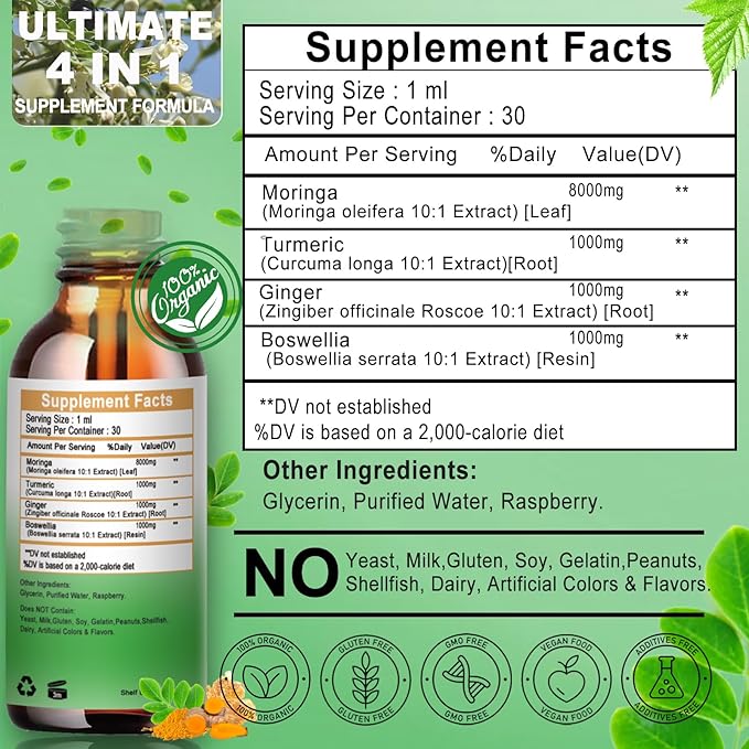 - THE POWER OF NATURE’S SUPERFOODS: Moringa, Turmeric, Ginger, and Boswellia combine to support optimal digestion, detoxify the body, and promote healthy blood cell function. Rich in essential Vitamins & Amino Acids, helps reduce inflammation, boost energy, and enhance overall vitality. With just 1-2 servings daily, this powerful 4-in-1 Moringa liquid supplement helps cleanse your body and support healthy circulation, making it a perfect addition to your daily health routine.