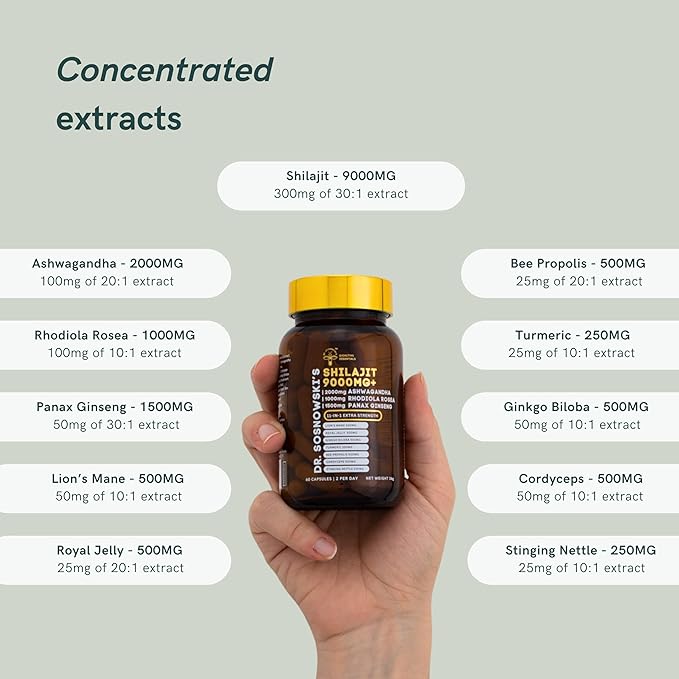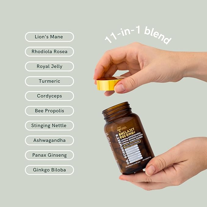 • CAREFULLY ENHANCED SUPERBLEND: Dr. Sosnowski's BioActive Shilajit blend is a unique 11-in-1 formula enhanced with potent extracts of Ashwagandha, Rhodiola Rosea, Ginseng Mushroom, Cordyceps Mushroom, Ginkgo Biloba, Lion's Mane Mushroom, Stinging Nettle, Turmeric, Royal Jelly and Bee Propolis, each carefully selected for its own naturally-occuring properties, vitamins, minerals or nutrients. Bee Propolis is included as Dr. Sosnowski's long-time hero ingredient, containing over 300 beneficial compounds, antioxidants and vitamins.