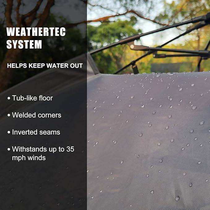 - All-Weather Protection:Stay dry and secure with high-quality 210D Oxford fabric, featuring a PU3000mm waterproof coating and fully sealed seams to prevent leaks. The sturdy fiberglass poles and wind-resistant structure ensure stability even in harsh conditions, keeping you safe in unexpected weather.