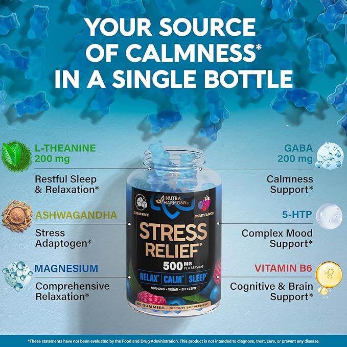 - Stress Relief Gummies 500mg — Enjoy a tasty and healthy way to support calmness, relaxation & well-being with these berry-flavored gummies. Formulated for stress relief support, these gummies are a must-have addition to your daily relaxation routine. Each serving delivers 500mg of stress-supporting ingredients to help you stay calm & relaxed.