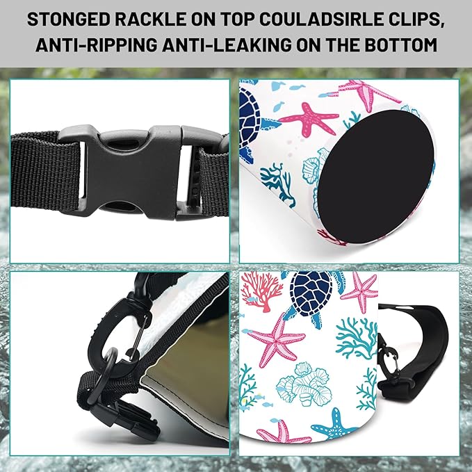 • Versatile Use for Every Adventure:Our sea turtle coral starfish waterproof backpack perfect for kayaking, camping, rafting, and hiking, our multifunctional dry bag adapts to various outdoor activities.IPX8 CERTIFIED WATERPROOF PHONE CASE: Included with your dry bag is an IPX8 certified waterproof phone case, compatible with phones up to 6.5 inches. Its snap-and-lock access and dual-sided clear windows allow for photos while keeping your device safe and dry.