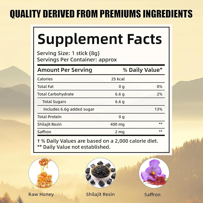 - Unique Ingredients, Natural Blend - In our honey shilajit sticks, Shilajit is rich in minerals and fulvic acid, Saffron contains unique crocin, and Honey is a nutritious natural sweetener. The combination of the three makes for a unique product experience