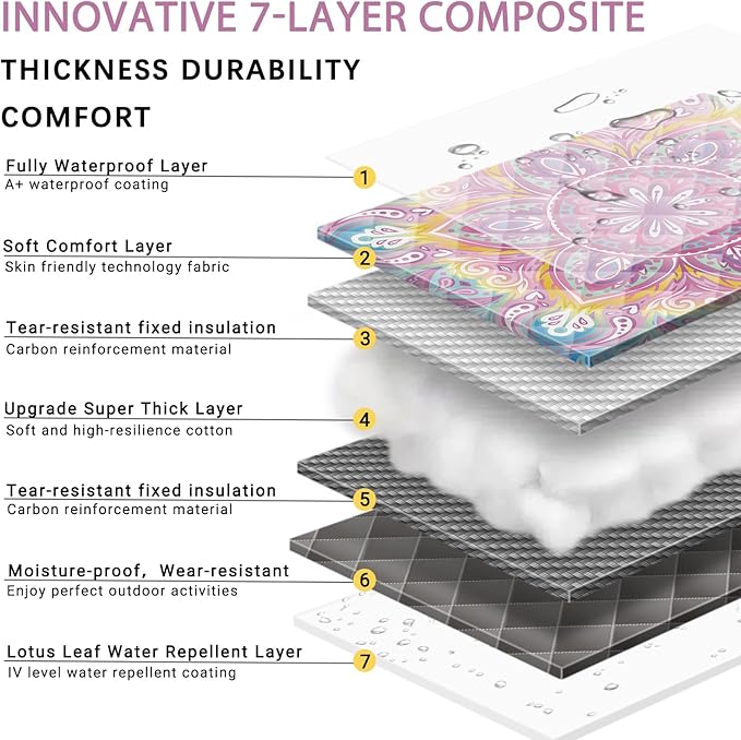 • [7-Layer Structure]This picnic mat features an advanced 7-layer structure design, with a soft cotton layer in the middle that provides excellent cushioning. This ensures a comfortable sitting and lying experience during outdoor activities. Whether you're on grass, sand, or using it indoors, it offers ample support.