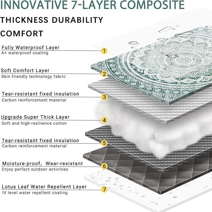 • [7-Layer Structure]This picnic mat features an advanced 7-layer structure design, with a soft cotton layer in the middle that provides excellent cushioning. This ensures a comfortable sitting and lying experience during outdoor activities. Whether you're on grass, sand, or using it indoors, it offers ample support.