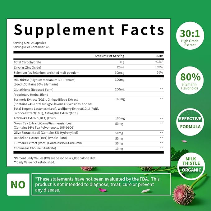 - EXTRA STRENGTH LIVER SUPPORT: Unleash powerful liver support with our organic milk thistle! Each capsule delivers a high-concentration 30:1 extract, standardized to 80% silymarin flavonoids , promoting optimal liver health, energy, and protection against common liver concerns such as fatty liver and alcoholic liver issues.