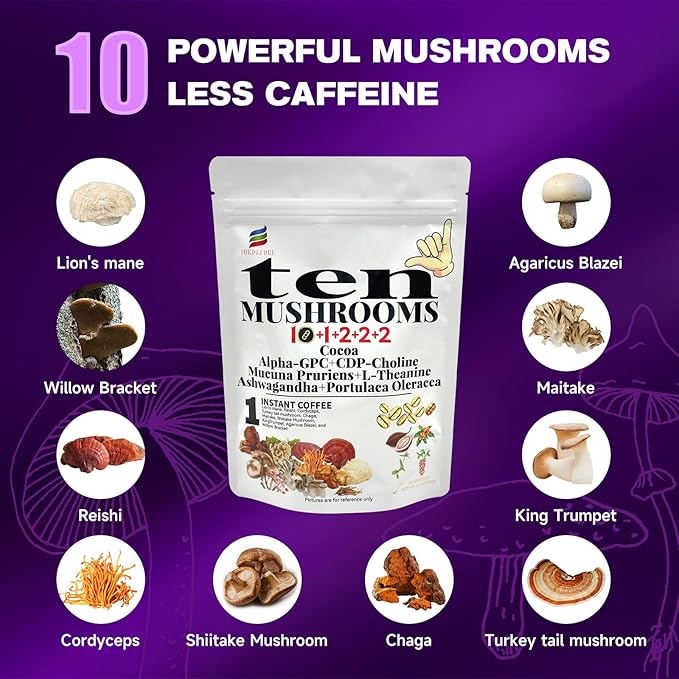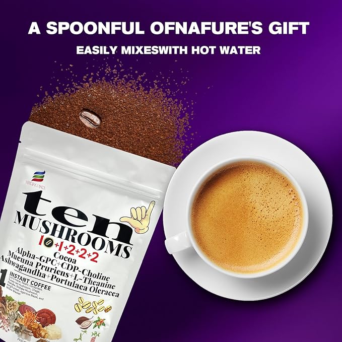 • 【10 Functional Mushrooms for Brain & Body Support】 This mushroom coffee combines the benefits of Lion’s Mane, Cordyceps, Turkey Tail, and more, providing enhanced cognitive function, immune support, and increased energy for a balanced and healthy lifestyle.