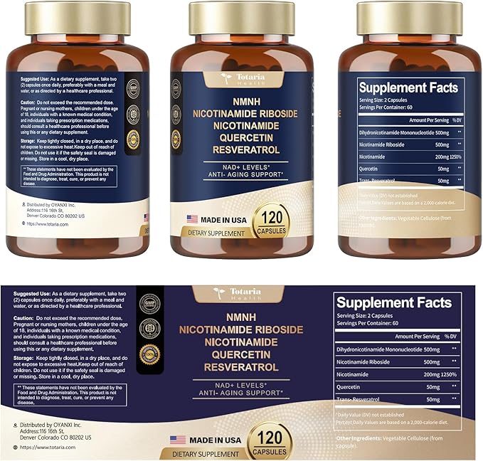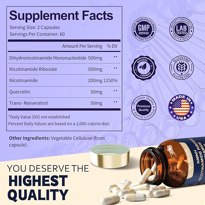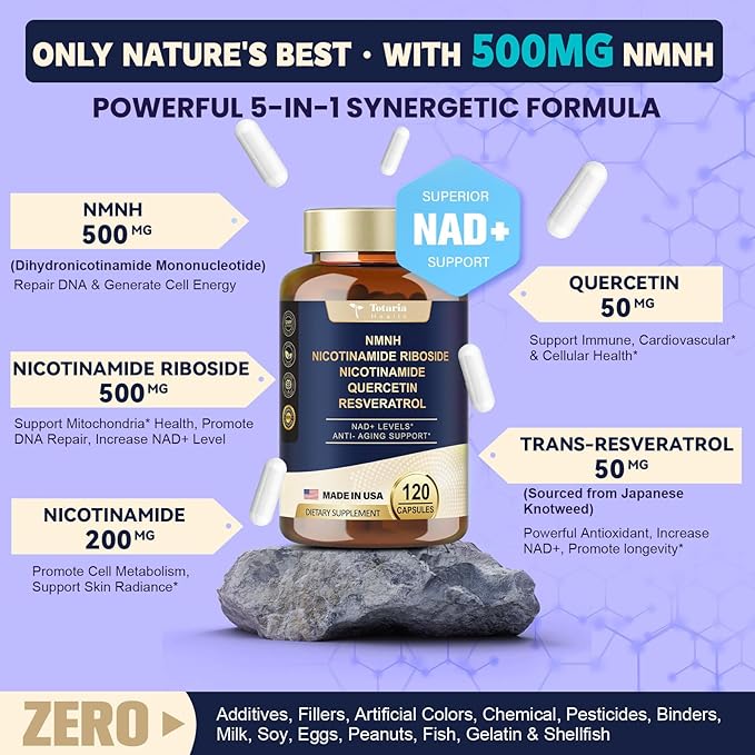 - Advanced Properietary Formula: NMNH boost NAD+ levels more effectively than a pure NAD supplement. Our natural and superior blend of NMNH, Nicotinamide Riboside, Nicotinamide, Quercetin, and Resveratrol works synergistically to boost energy levels, strengthen immunity, improve brain health and cognition, and support cellular and DNA health*.