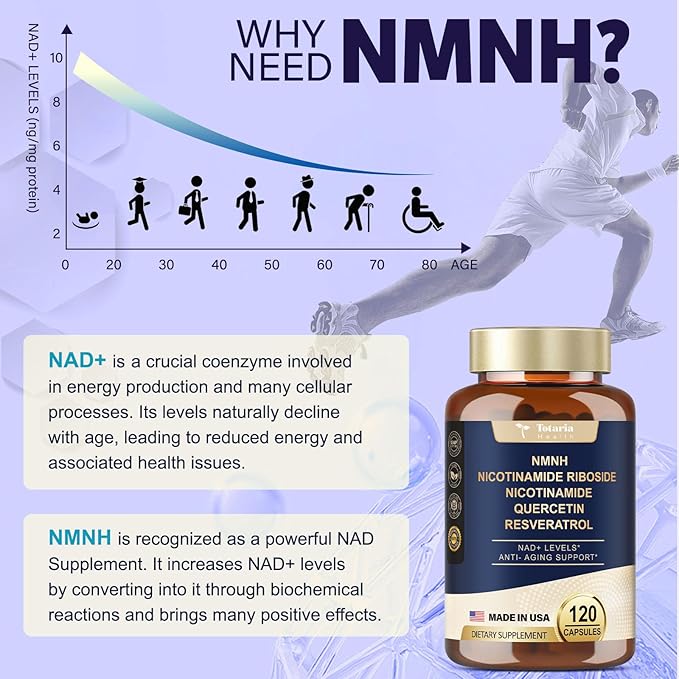 - Vital for Elevating NAD+ Level: As we age, NAD+ levels naturally decline. NMNH is a novel and highly effective ingredient that increases NAD+ (Nicotinamide adenine dinucleotide) levels. Scientific studies have shown that as an NAD supplement, NMNH supports healthy aging, skin health, immune function, boosts NAD+, and enhances cellular health, Energy levels, and longevity.