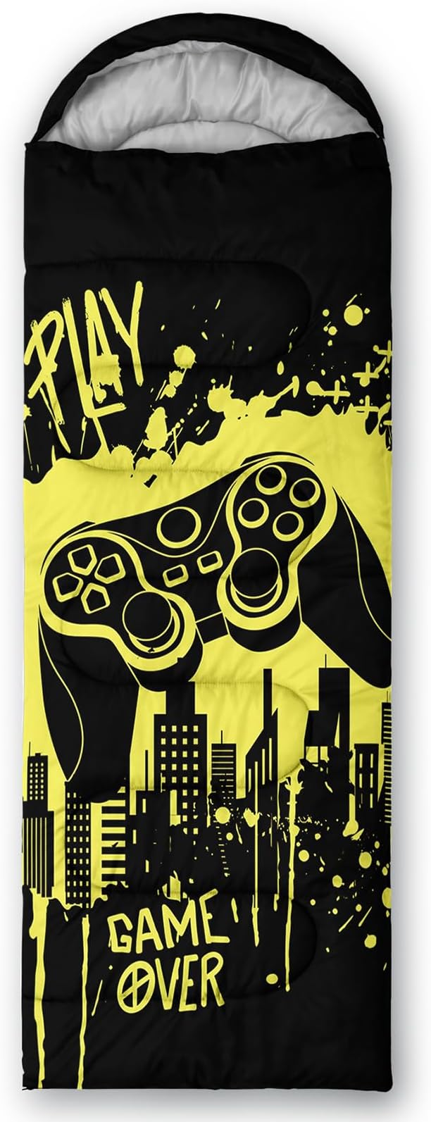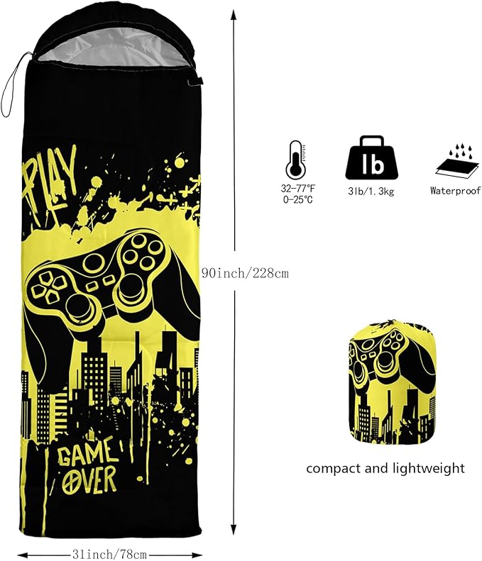- Unique Gaming Design:This Gaming pattern sleeping bag is made of 3D digital printing with vibrant colors and patterns,size: 31W x 90L inches,temperature range: 32℉-77℉ (0℃-25℃),it also also have a weather resistant waterproof design to keep you warm and prevent you from any dampness,can be used in 3 seasons