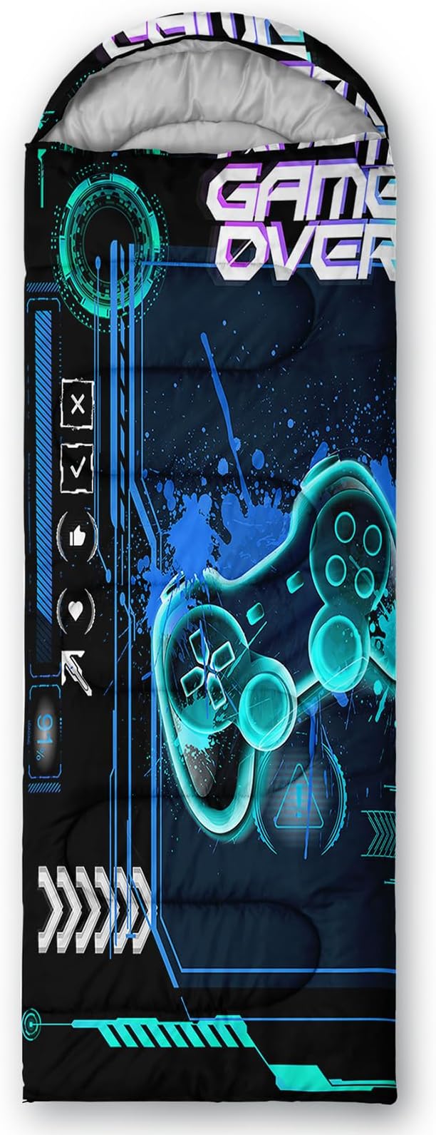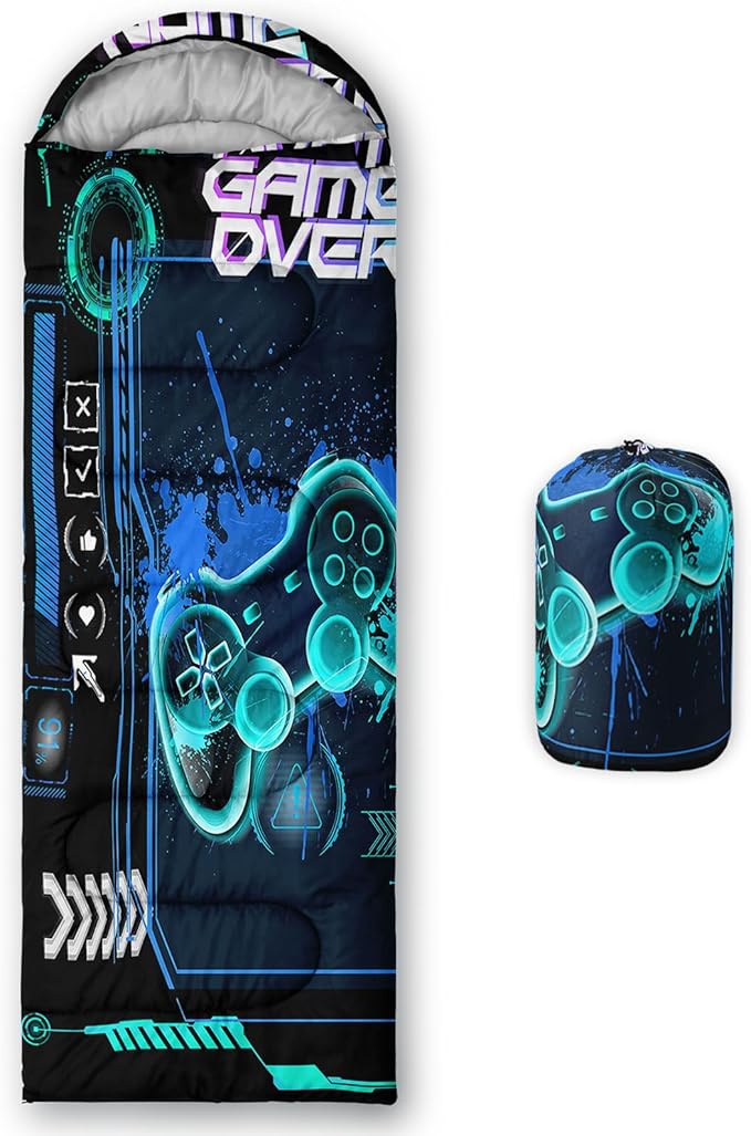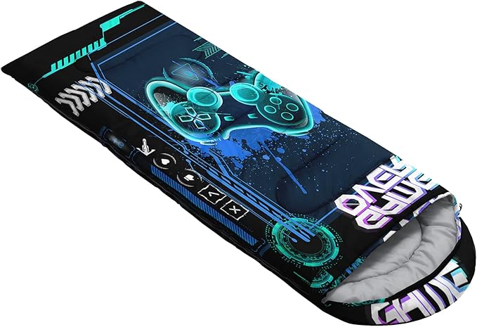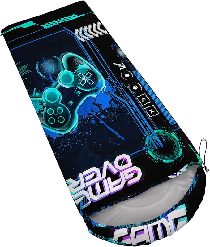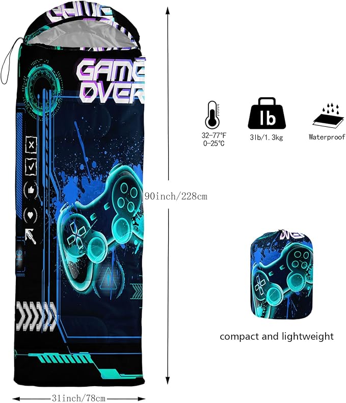 - Unique Gaming Design:This Gaming pattern sleeping bag is made of 3D digital printing with vibrant colors and patterns,size: 31W x 90L inches,temperature range: 32℉-77℉ (0℃-25℃),it also also have a weather resistant waterproof design to keep you warm and prevent you from any dampness,can be used in 3 seasons