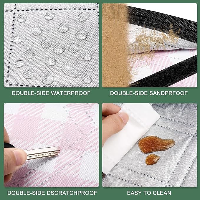 - WATERPROOF, SANDPROOF & SCRATCHPROOF-EASY TO CLEAN: Why are we 5 layers? Because we add an extra layer of protective film on the top and bottom. And The picnic blanket backing is made of high-quality Aluminium Film backing waterproof material to prevent it from getting wet on wet lawns or beaches. Picnic mats are easy to clean and care for, easily shaking off and wiping away dirt, mud, wet grass and sand.