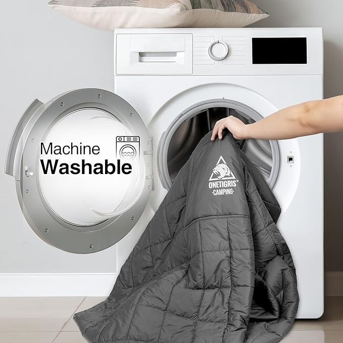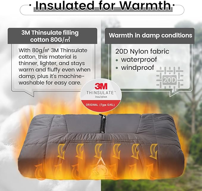 - 3M Thinsulate Insulation: Filled with 3M Thinsulate, this camping blanket delivers 1.5 times the warmth of down and double the loft of other materials.. Thin, lightweight, and machine-washable, it provides unbeatable insulation even in damp conditions, capturing body heat with ease. The 20D nylon fabric adds a soft, luxurious feel while offering waterproof, windproof, and breathable protection for all-weather comfort