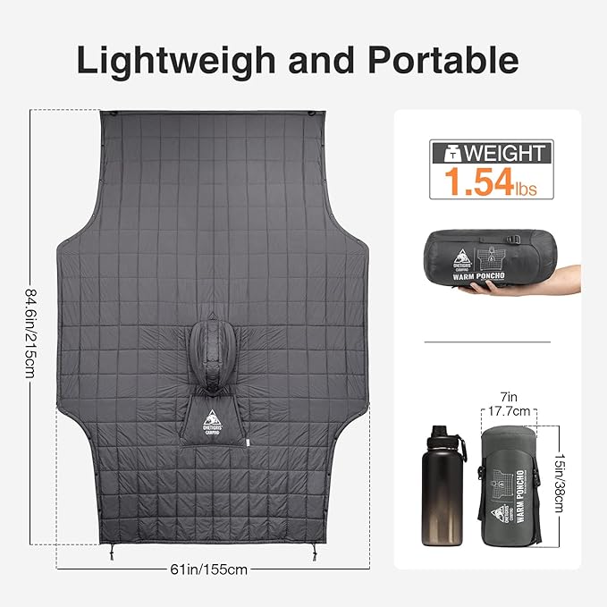 - Ultralight and Portable:: When unfolded, the honcho poncho measures 84.6 x 61 inches, but packs down to just 15 x 7 inches in its included compression sack. After folding and compressing, it becomes small and space-saving. Weighing only 1.54 lbs, this compact blanket poncho is lightweight, easy to fit in a backpack, and can even be used as a pillow, making it perfect for travel or camping