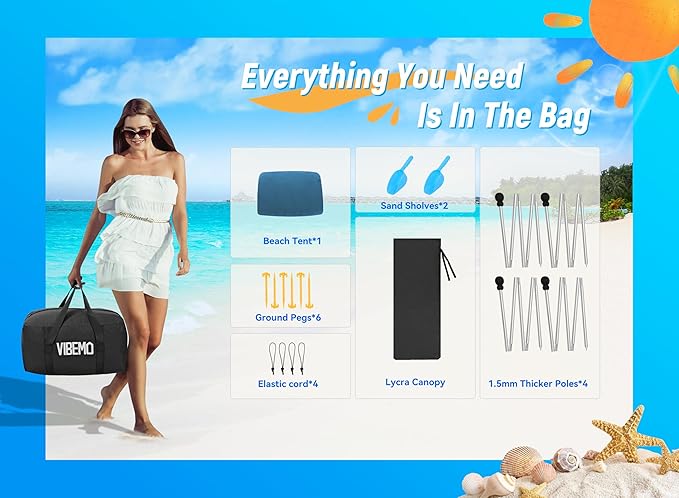 - 【All-Weather Stability with Heavy-Duty Accessories】The beach shade canopy includes 4 steel stakes, 4 reinforced elastic cord and 4 wind ropes, secure the canopy in winds up to 35mph. The upgraded 1.5mm thickened pole makes the canopy more wind-resistant and less likely to deform. 2 sand shovels can fill the 6 sandbag corners with sand and bury them in the sand, so that it is not easy to blow away even when strong winds come.
