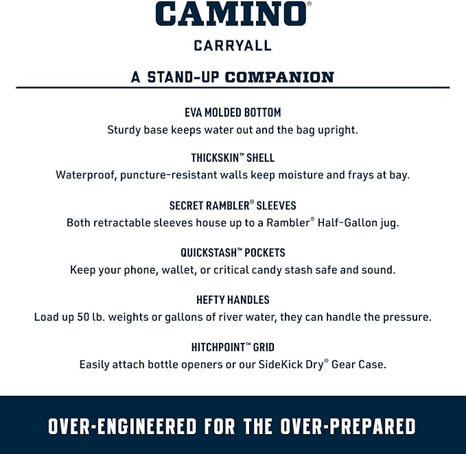 • MULTI-FUNCTIONAL - The waterproof, puncture-proof, Camino Carryall is designed for whatever the day throws your way. Perfect tote bag for the boat, lake, pool, beach, camping or road trips. Easy to haul your gear and easy to clean, the Camino Carryall is the last word in uncompromising convenience