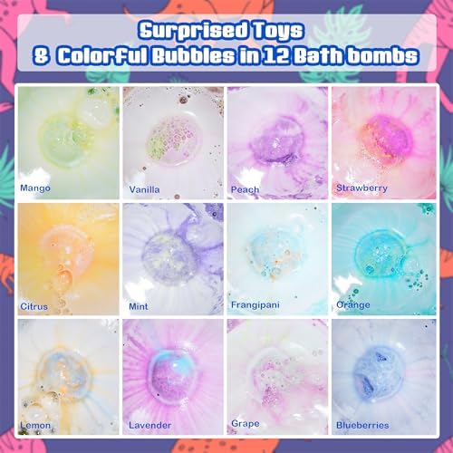 • 12 Colorful Bath Bomb Set for Kids: Our bath bombs contains 12 different individually wrapped dino egg bath bombs with 12 different dinosaur toys inside. The dinosaur toys for kids are made of safe materials, there are 12 scents in this set,Mango,uanilla,peach,Strawberry,citrus,mint,frangipani,orange,lemon, lavender,grape,Blueberry. Multiple smells give you more choices. Vibrant colors and fizz, kids can enjoy a playful bathtime atmosphere while the delightful scents create an enjoyable sensory experience.