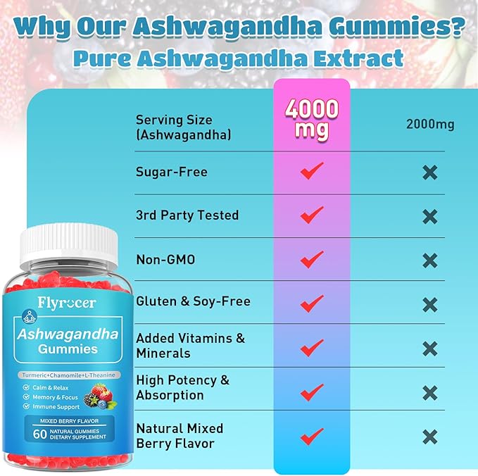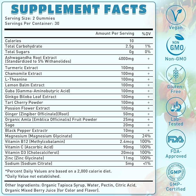 - Delicious Mixed Berry Flavor, Sugar-Free & Vegan: Enjoy the delicious mixed berry flavor of our ashwagandha gummies with no added sugar. They are vegan, non-GMO, and gluten-free, offering a tasty and healthy way to incorporate ashwagandha into your daily routine