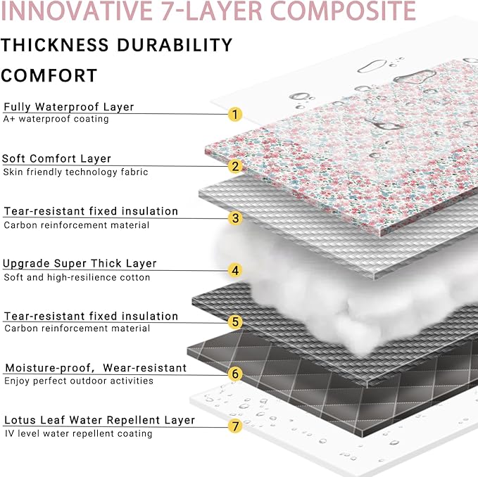 • [7-Layer Structure]This picnic mat features an advanced 7-layer structure design, with a soft cotton layer in the middle that provides excellent cushioning. This ensures a comfortable sitting and lying experience during outdoor activities. Whether you're on grass, sand, or using it indoors, it offers ample support.