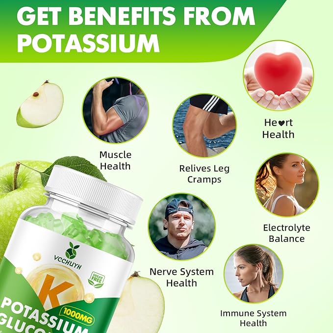 - 1000mg High-Potency Potassium Gummies: Deliver optimal daily support with 1000mg potassium gluconate per serving (2 gummies), specially formulated to address muscle cramps, fatigue and electrolyte imbalance