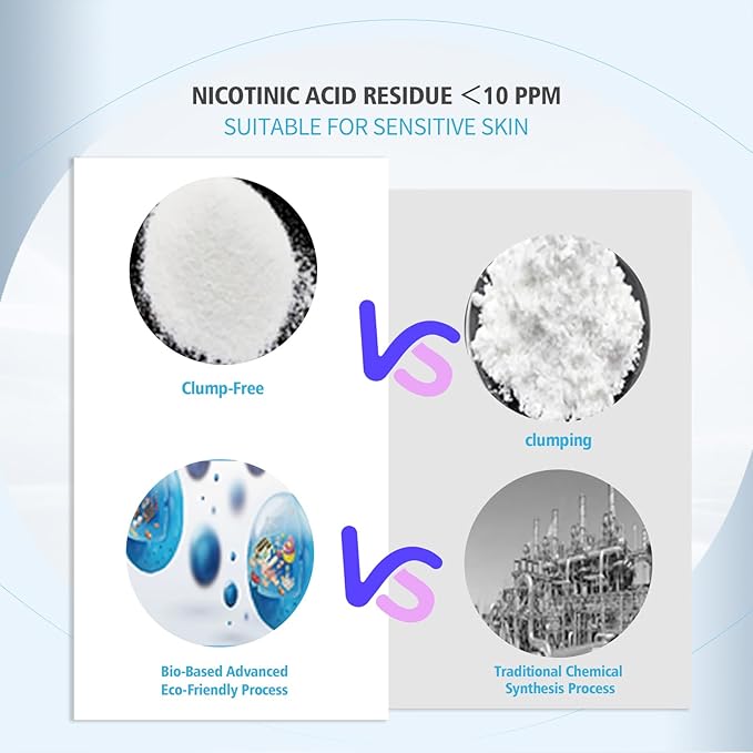 • Low Nicotinic Acid Residue: With a Nicotinic Acid residue of less than 10 ppm, this cosmetic grade niacinamide powder is ideal for sensitive skin, providing a soothing skincare experience without irritation. Enjoy the benefits of the ordinary niacinamide powder, specifically formulated for safety and efficacy.