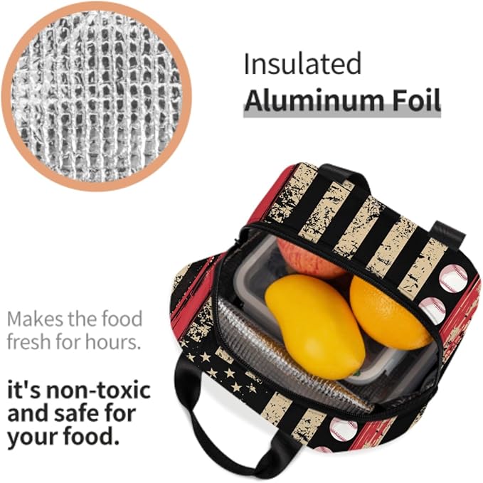 - GOOD LUNCH BAG USE - The Baseball American Flag lunch box durable and easy to maintain and clean. If sauce spills inside, just wipe the lunch bag clean in seconds. With ice pack,insulation helps retain hot and cold temperatures whole day to improve food quality, freshness and taste,keep the meal healthy. Your child will love having their favorite kids lunch containers bag designs with them at home and on the go.